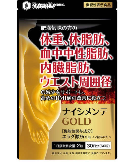 脂肪も糖もまとめてケアしたい方に向いているサプリです。ナイシメンテGOLDは、複数の機能でダイエットを支える機能性表示食品。12粒でエラグ酸を9mg配合し、肥満気味の方の体重や体脂肪、内臓脂肪、血中中性脂肪、ウエスト周囲径の改善をサポートするとされています。
